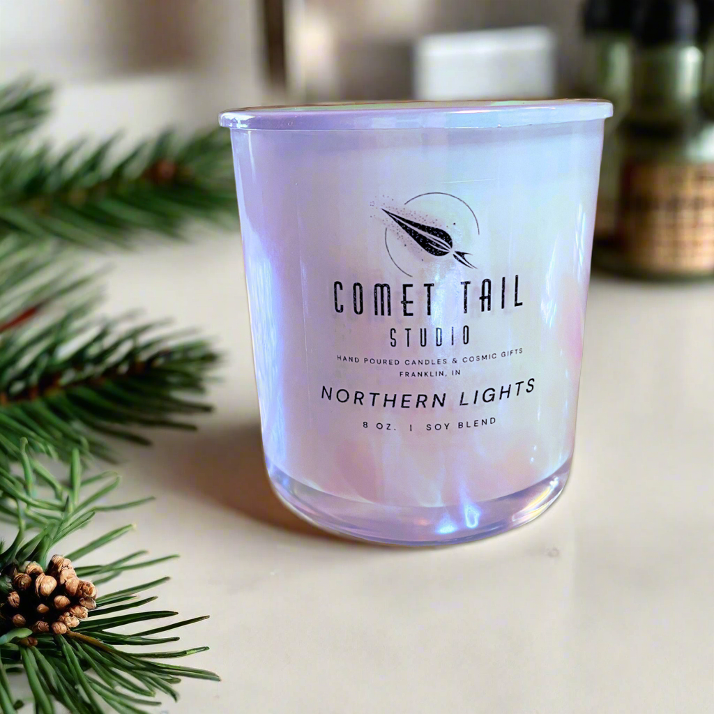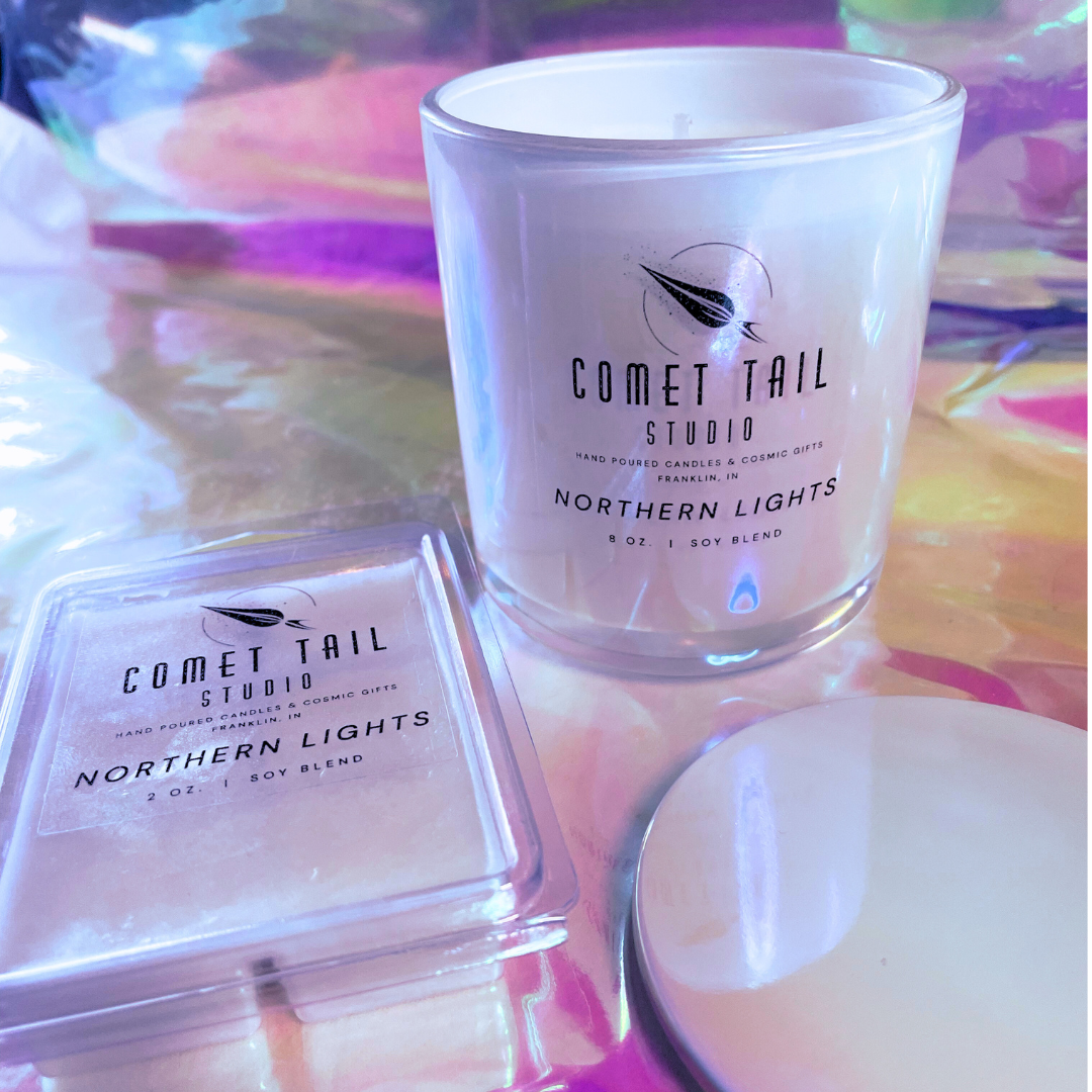 Available as an 8 oz candle or a 2 oz wax tart (6 squares). Each piece is hand-poured in small batches using all-natural 464 soy wax, premium fragrance oils, and essential oils. The candles are poured into iridescent vessels designed to reflect light like the cosmos, while the soy melts offer a flameless, richly scented option. Clean-burning, thoughtfully crafted, and designed to elevate your space with over 40 hours of fragrance.